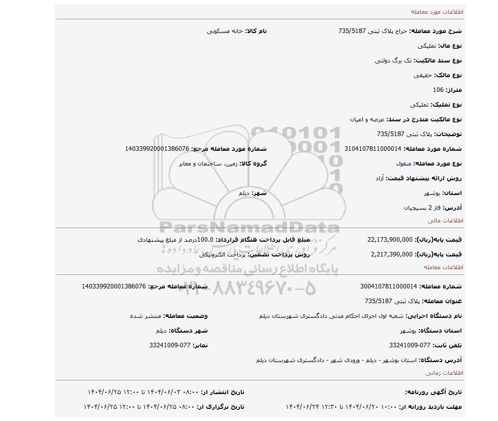 مزایده پلاک ثبتی 735/5187, مزایده، پلاک ثبتی 735/5187