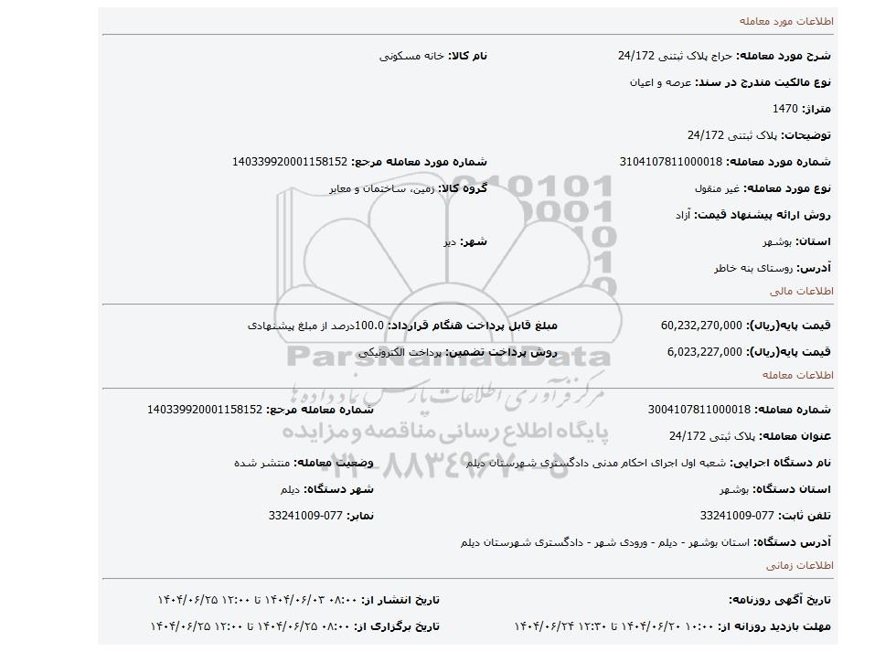 شرح مورد معامله: حراج پلاک ثبتنی 24/172 | نام کالا: خانه مسکونی | |