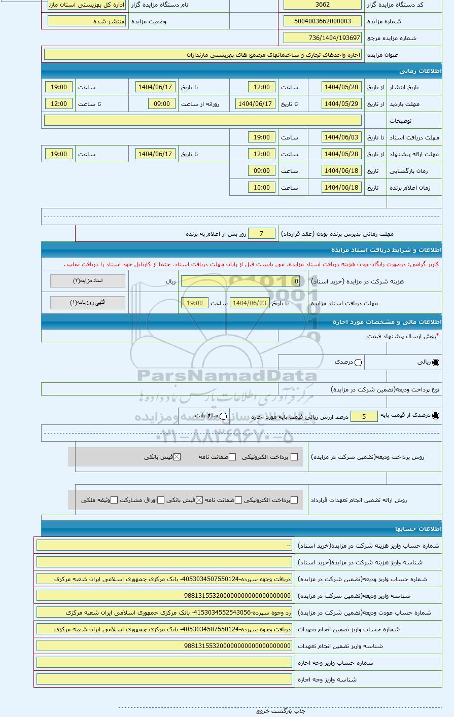| شماره مورد اجاره | 5104003662000132 | نوع برگزاری مزایده | مزایده عمومی | |