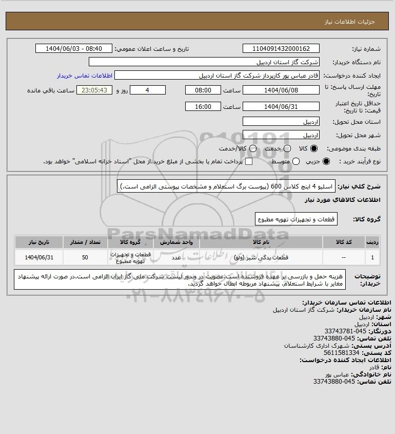 استعلام بها و موضوع استعلام استعلام اسلیو 4 اینچ کلاس 600 (پیوست برگ استعلام و مشخصات پیوستی الزامی است.) به اطلاع کلیه شرکت‌ها و افراد متخصص واجد شرایط می‌رساند، آگهی گذار در نظر دارد از طریق استعلام بها، نسبت به انتخاب و دریافت پیشنهادات اقدام نماید. این استعلام با کد آگهی ثبت شده در سامانه خبرگزاری پارس نماد : 9448814 منتشر شده است. مشخصات استعلام : تاریخ شروع استعلام: 1404/06/03 آخرین مهلت ارسال پیشنهاد قیمت : 1404/06/08 و محل اجرای پروژه : استان اردبیل میباشد. استعلام قیمت مورد درخواست : استعلام اسلیو 4 اینچ کلاس 600 (پیوست برگ استعلام و مشخصات پیوستی الزامی است.) با دسته‌بندی‌های تخصصی و گروه های مرتبط : شیرآلات, تجهیزات نفت و گاز, استعلام اطلاع رسانی میگردد.