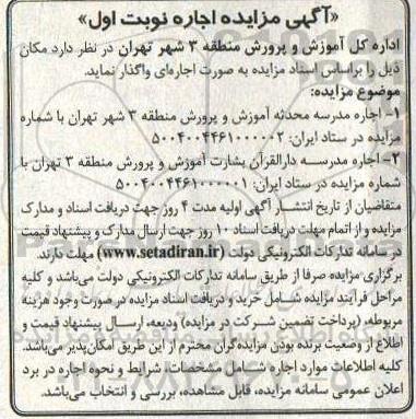 اداره کل آموزش و پرورش منطقه 3 شهر تهران در نظر دارد مکان ذیل را بر اساس اسناد مزایده به صورت اجاره ای واگذار نماید.