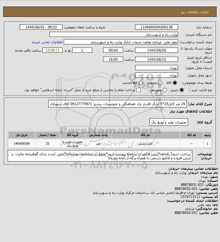 شرح کلی نیاز: 25 متر کابل25*5 مارک افشار نژاد هماهنگی و تضوصیحات بیشتر 09127779571 آقای شهبازی