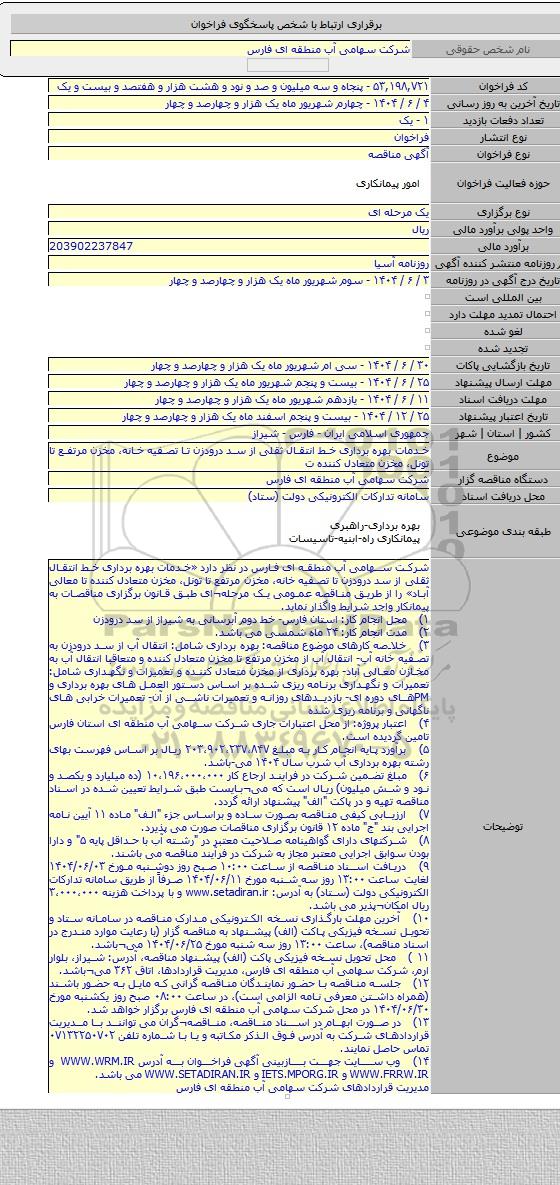 شرکت سهامی آب منطقه ای فارس در نظر دارد «خدمات بهره برداری خط انتقال ثقلی از سد درودزن تا تصفیه خانه، مخزن مرتفع تا تونل، مخزن متعادل کننده تا معالی آباد» را از طریق مناقصه عمومی یک مرحله¬ای طبق قانون برگزاری مناقصات به پیمانکار واجد شرایط واگذار نماید.