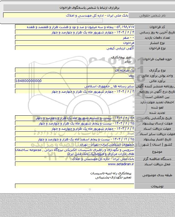مناقصه سرویس و نگهداری و راهبری تاسیسات الکتریکی نیروگاه دیزلی ٬ مجموعه ساختمان های ادارات مرکزی و فتوولتائیک بانک ملی ایران از کلیه افراد متخصص و شرکتها واجد شرایط دعوت به عمل میآید در مناقصه با کد خبرگزاری پارس نماد: 9449271 شرکت نمایند.