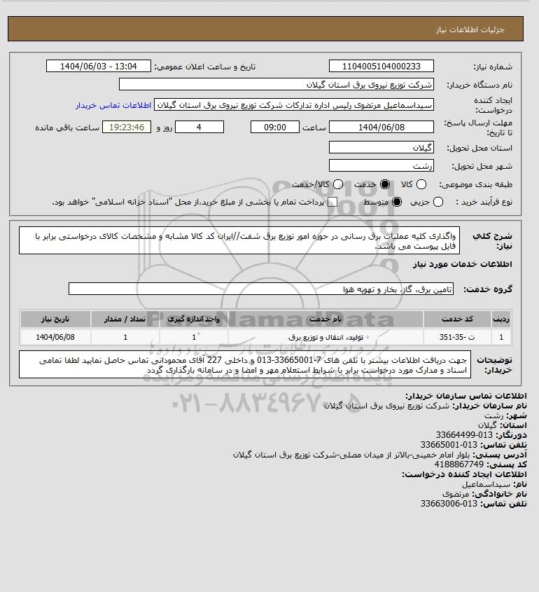 شرح کلی نیاز: واگذاری کلیه عملیات برق رسانی در حوزه امور توزیع برق شفت//ایران کد کالا مشابه و مشخصات کالای درخواستی برابر با فایل پیوست می باشد.