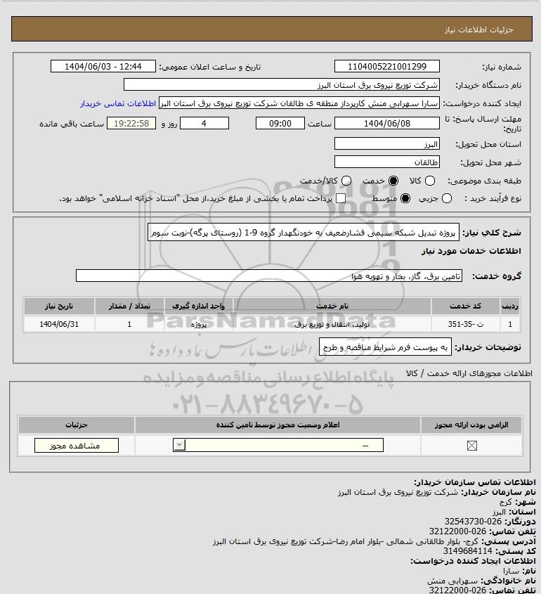 شرح کلی نیاز: پروژه تبدیل شبکه سیمی فشارضعیف به خودنگهدار گروه 9-1 (روستای پرگه)-نوبت سوم