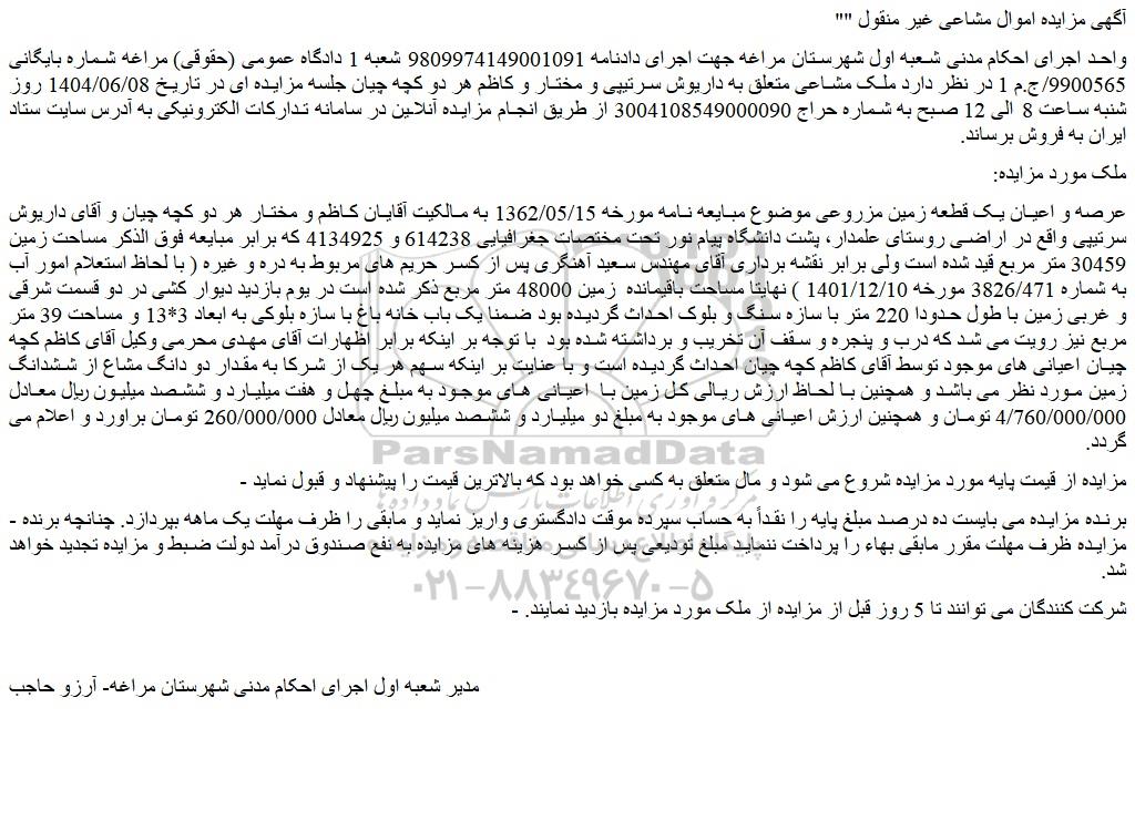 واحد اجرای احکام مدنی شعبه اول شهرستان مراغه جهت اجرای دادنامه 9809974149001091 شعبه 1 دادگاه عمومی (حقوقی) مراغه شماره بایگانی 9900565/ج.م 1 در نظر دارد ملک مشاعی متعلق به داریوش سرتیپی و مختار و کاظم هر دو کچه چیان جلسه مزایده ای در تاریخ 1404/06/08 روز شنبه ساعت 8 الی 12 صبح به شماره حراج 3004108549000090 از طریق انجام مزایده آنلاین در سامانه تدارکات الکترونیکی به آدرس سایت ستاد ایران به فروش برساند.
