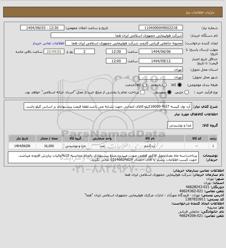 شرح کلی نیاز: آرد نول کیسه 27%-16000کیلو-کالای انتخابی جهت تشابه می باشد.لطفا قیمت پیشنهادی بر اساس کیلو باشد.