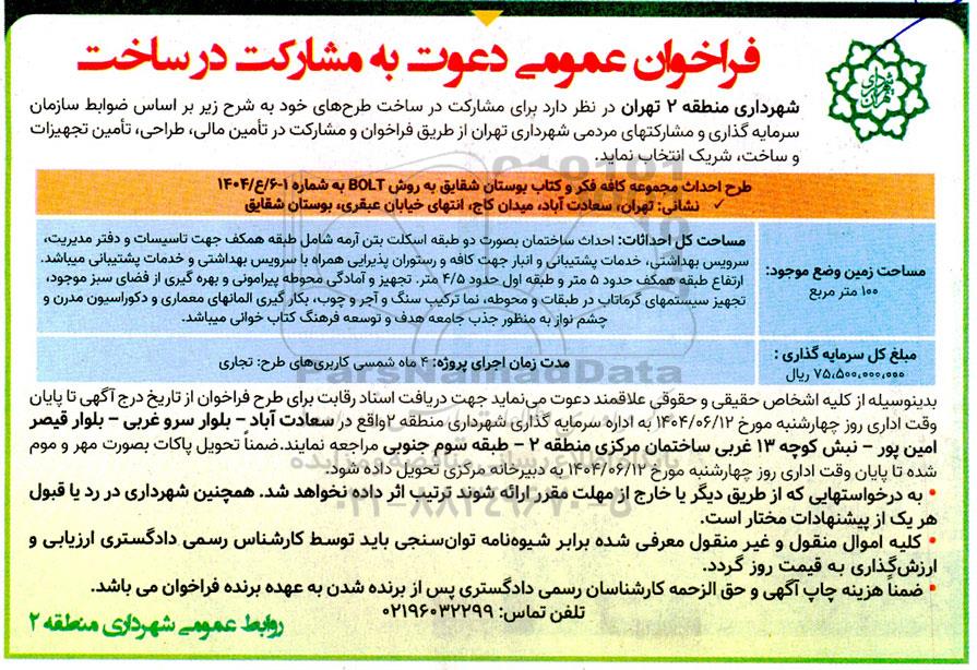 بدینوسیله از کلیه اشخاص حقیقی و حقوقی علاقمند دعوت می نماید جهت دریافت اسناد رقابت برای طرح فراخوان از تاریخ درج اگهی تا پایان وقت اداری روز چهارشنبه مورخ 1404.6.12 به اداره سرمایه گذاری شهرداری منطقه 2 واقع در سعادت آباد - بلوار سرو غربی - بلوار قیصر امین پور - نبش کوچه 13 غربی - ساختمان مرکزی منطقه 2 - طبقه سوم جنوبی مراجعه نمایند. ضمنا تحویل پاکات به صورت مهر و موم شده تا پایان وقت اداری روز چهارشنبه مورخ 1404.6.12 به دبیرخانه مرکزی تحویل داده شود.