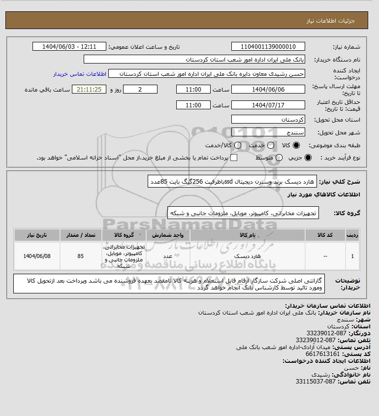 1 -- هارد دیسک عدد تجهیزات مخابراتی، کامپیوتر، موبایل، ملزومات جانبی و شبکه 85 1404/06/08