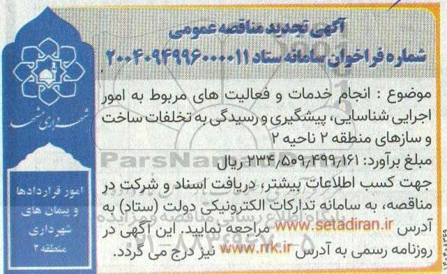 موضوع : انجام خدمات و فعالیت های مربوط به امور اجرایی شناسایی، پیشگیری و رسیدگی به تخلفات ساخت و سازهای منطقه 2 ناحیه 2
