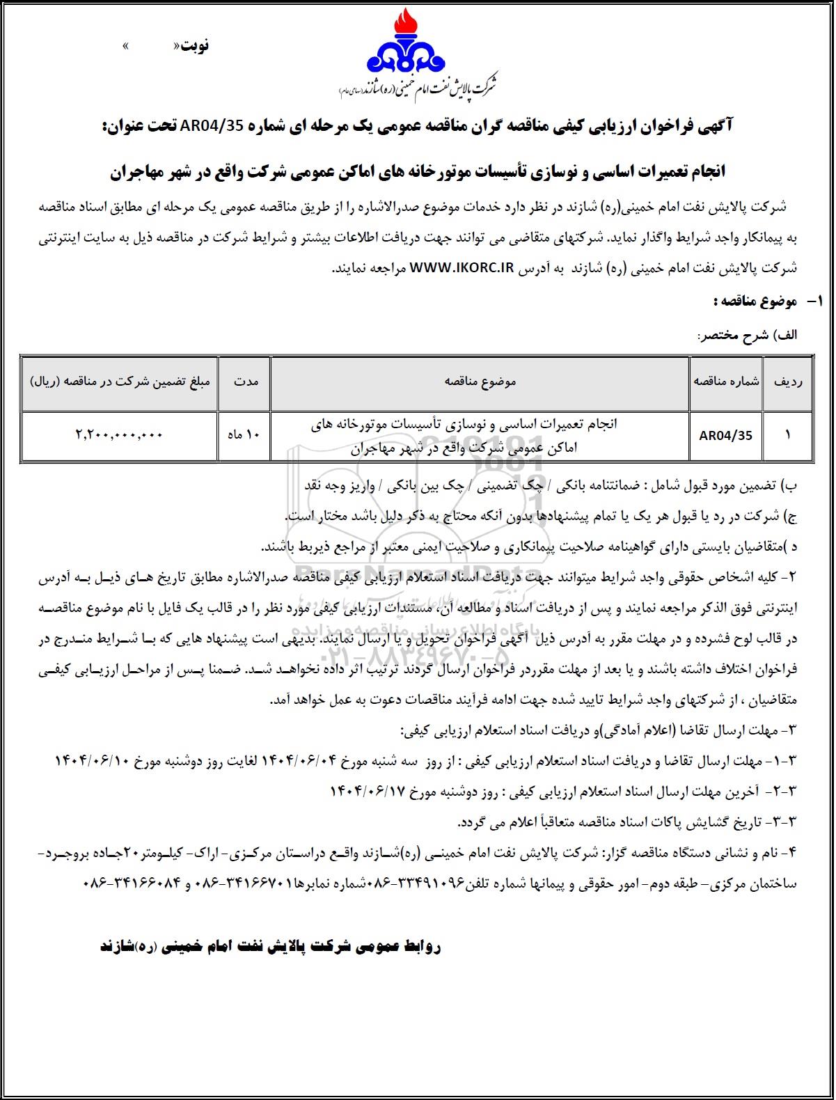 | 1 | AR04/35 | انجام تعمیرات اساسی و نوسازی تاسیسات موتورخانه های اماکن عمومی شرکت واقع در شهر مهاجران | 10 ماه | 2.200.000.000 |