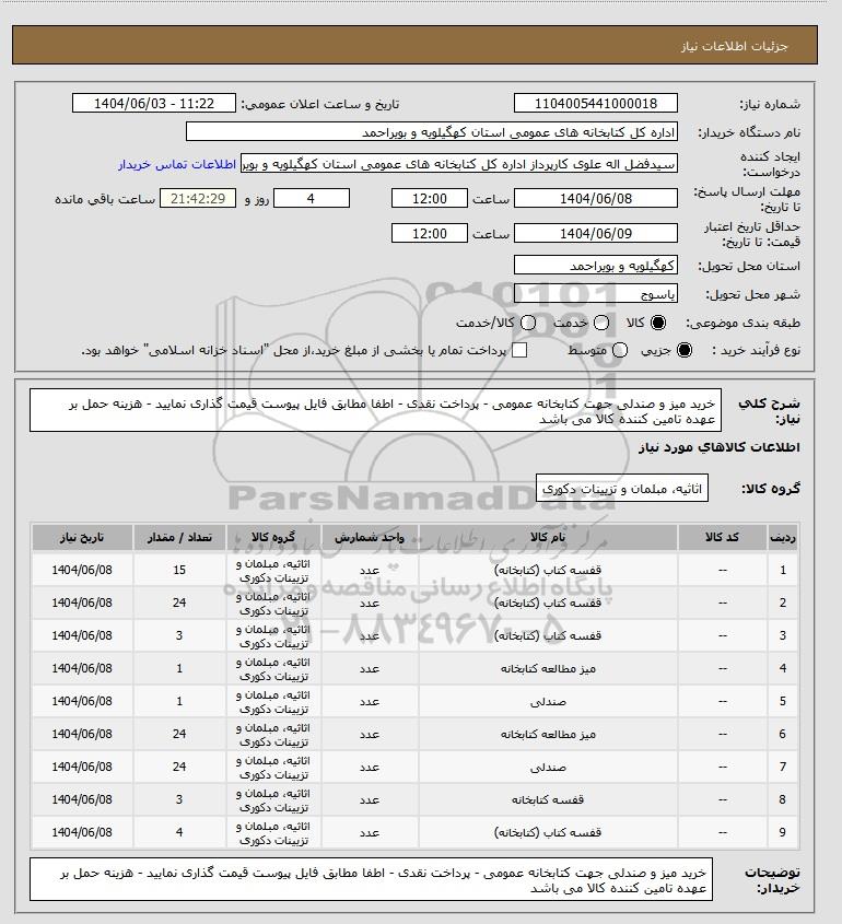 شرح کلی نیاز: خرید میز و صندلی جهت کتابخانه عمومی - پرداخت نقدی - اطفا مطابق فایل پیوست قیمت گذاری نمایید - هزینه حمل بر عهده تامین کننده کالا می باشد