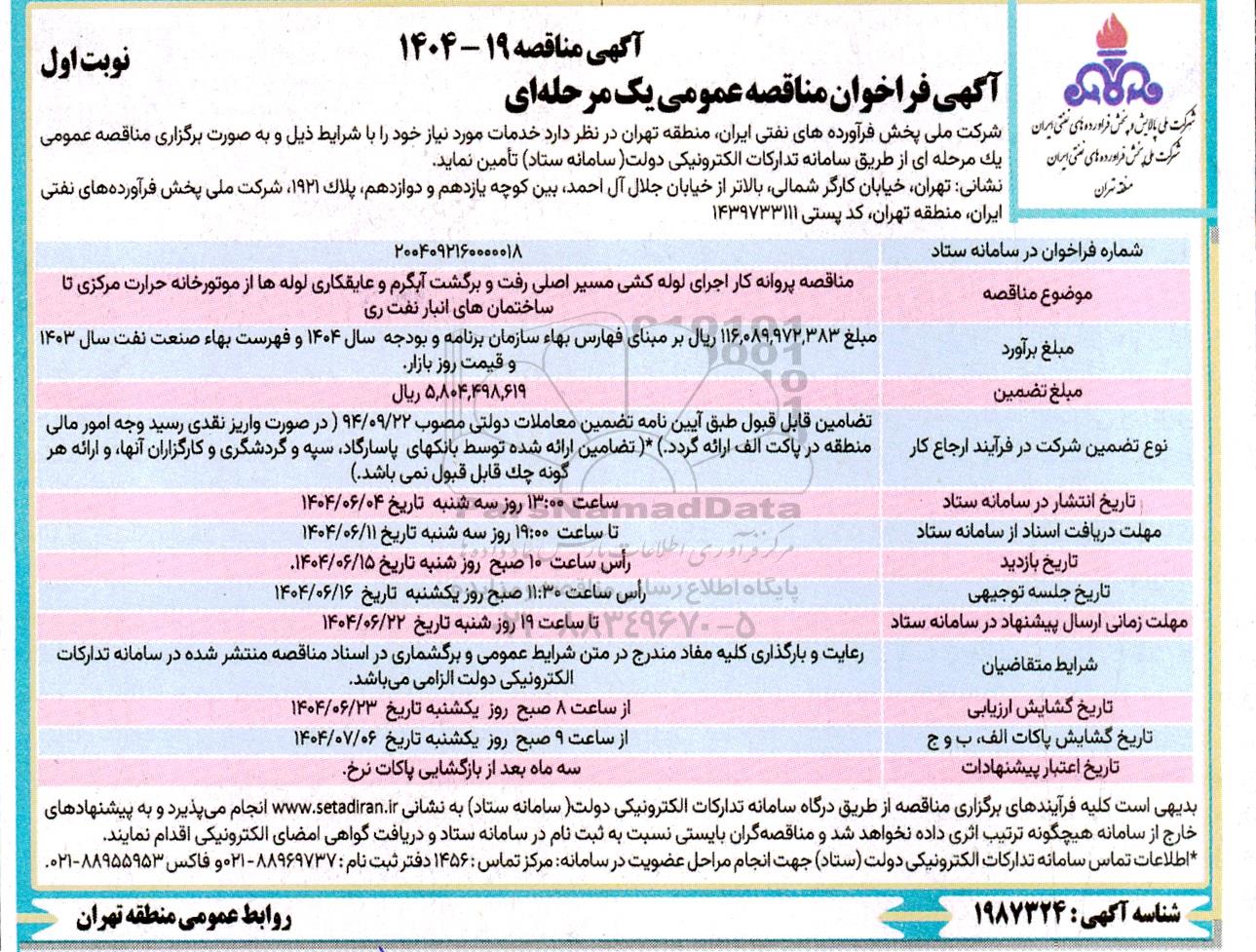 آگهی فراخوان مناقصه عمومی یک مرحله ای ؟ نوبت اول / آگهی مناقصه 19- 1404