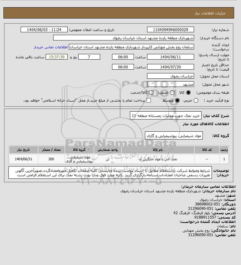 شرح کلی نیاز: خرید نمک جهت عملیات زمستانه منطقه 11