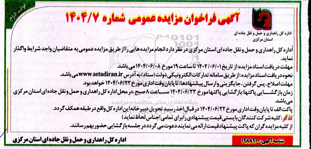 اداره کل راهداری و حمل و نقل جاده ای استان مرکزی در نظر دارد انجام مزایده هایی را از طریق مزایده عمومی به متقاضیان واجد شرایط واگذار نماید.