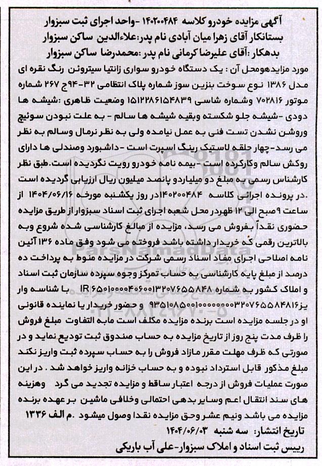 مزایده فروش یک دستگاه اتومبیل سواری زانتیا سیتروئن رنگ نقره ای