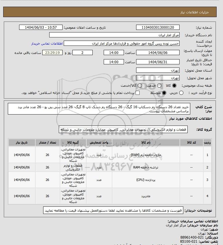 شرح کلی نیاز: خرید تعداد 26 دستگاه رم دسکتاپ 16 گیگ - 26 دستگاه رم دسک تاپ 8 گیگ- 26 عدد سی پی یو - 26 عدد مادر برد براساس مشخصات پیوست
