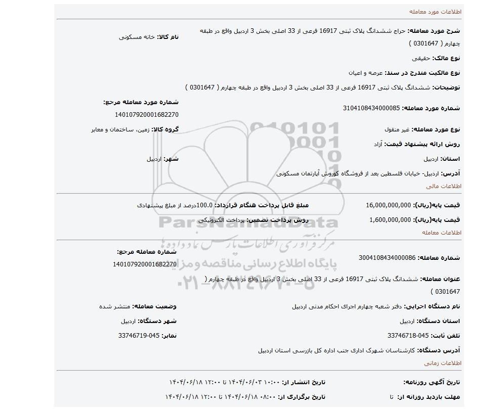 شرح مورد معامله: حراج ششدانگ پلاک ثبتی 16917 فرعی از 33 اصلی بخش 3 اردبیل واقع در طبقه چهارم ( 0301647 )نام کالا: خانه مسکونی