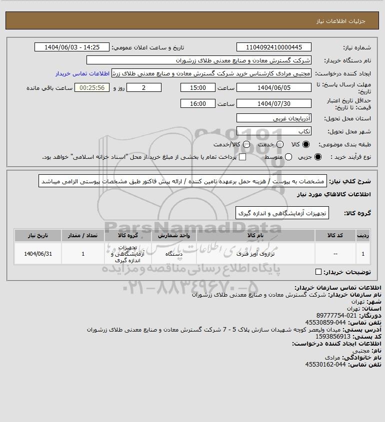 نام دستگاه خریدار:شرکت گسترش معادن و صنایع معدنی طلای زرشوران