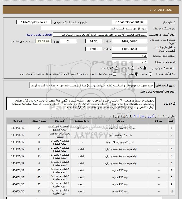 شرح کلی نیاز: خرید تجهیزات موتورخانه و آسانسور(طبق شرایط پیوست) مدارک پیوست باید مهر و امضا و بارگذاری گردد.