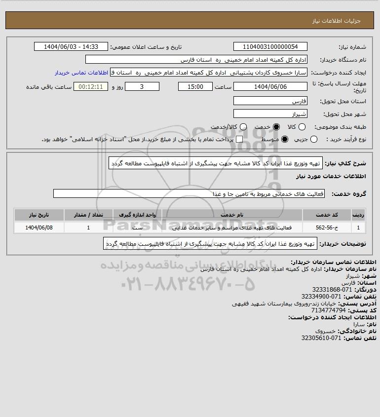 شرح کلی نیاز: تهیه وتوزیع غذا ایران کد کالا مشابه جهت پیشگیری از اشتباه فایلپیوست مطالعه گردد