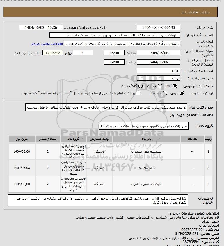 | 1 | -- | سیستم تلفن سانترال | دستگاه | تجهیزات مخابراتی، کامپیوتر، موبایل، ملزومات جانبی و شبکه | 2 | 1404/06/08 |