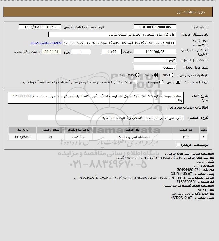 شرح کلی نیاز: عملیات مرمت سازه های آبخیزداری شرق آباد ارسنجان (سنگی-ملاتی) براساس فهرست بها پیوست مبلغ 970000000 ریال