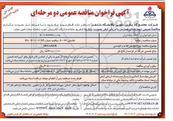 شرکت مجتمع گاز پارس جنوبی (پالایشگاه یازدهم) در نظر دارد اقلام مورد نیاز خود را با شرایط ذیل بصورت برگزاری مناقصه عمومی دو مرحله ای همزمان با ارزیابی کیفی بصورت یکپارچه از طریق سامانه تدارکات الکترونیکی دولت (سامانه ستاد) تامین نماید: