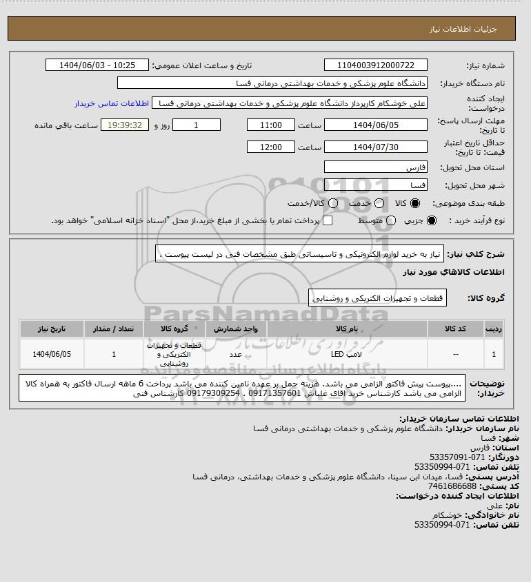 شرح کلی نیاز: نیاز به خرید لوازم الکترونیکی و تاسیساتی طبق مشخصات فنی در لیست پیوست .