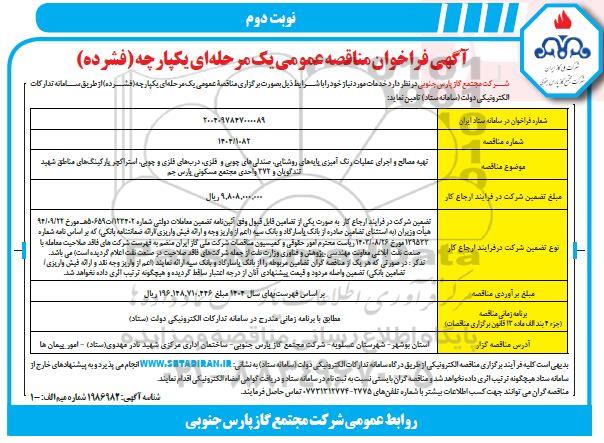 شرکت مجتمع گاز پارس جنوبی در نظر دارد خدمات مورد نیاز خود را با شرایط ذیل بصورت برگزاری مناقصه عمومی یک مرحله ای یکپارچه (فشرده) از طریق سامانه تدارکات الکترونیکی دولت (سامانه ستاد) تامین نماید