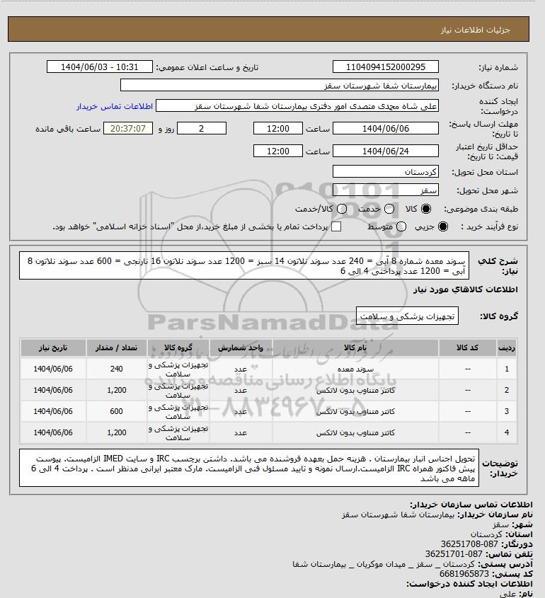 شرح کلی نیاز: سوند معده شماره 8 آبی = 240 عدد