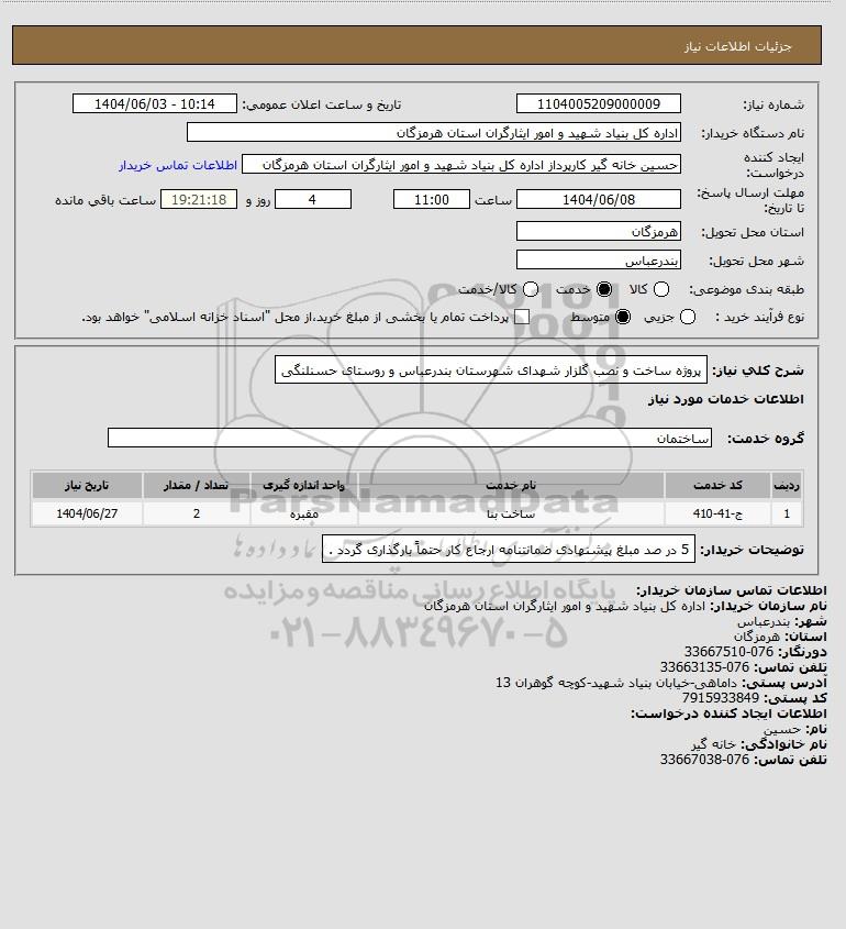 شرح کلی نیاز: پروژه ساخت و نصب گلزار شهدای شهرستان بندرعباس و روستای حسنلنگی