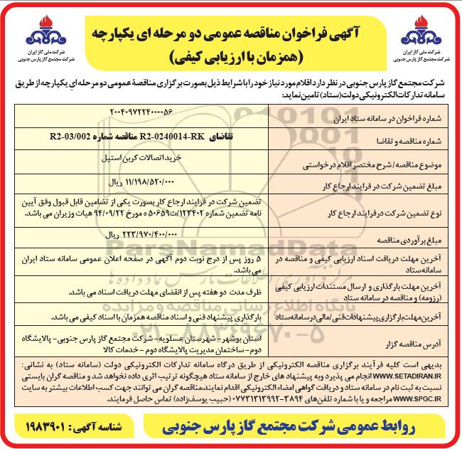 شرکت مجتمع گاز پارس جنوبی در نظر دارد اقلام مورد نیاز خود را با شرایط ذیل به صورت برگزاری مناقصه عمومی یک مرحله ای یکپارچه از طریق سامانه تدارکات الکترونیک دولت (سامانه ستاد) تامین نماید: