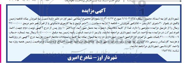 شهرداری اوز به استناد مجوز شماره 6/1403/434 مورخ 1403.04.27 شورای محترم اسلامی شهر اوز در نظر دارد نسبت به فروش یک قطعه زمین واقع در بلوار 30 متری کنار سبز - تفکیکی فروزش - قطعه 16 و به مساحت 300 مترمربع و با کاربری مسکونی و از قرار هر مترمربع 27.000.000 ریال را از طریق مزایده عمومی را دارد. لذا از کلیه متقاضیان دعوت به عمل می آید حداکثر 10 روز پس از درج آگهی نوبت دوم جهت اخذ فرم شرکت در مزایده به واحد درآمد شهرداری مراجعه نمایند واریز 5 درصد قیمت پایه زمین به مبلغ 405.000.000 ریال به شماره حساب 3100002594009 بانک ملی مرکزی اوز الزامی است. شهرداری در رد یا قبول یک یا کلیه پیشنهادات مختار است. هزینه درج آگهی در روزنامه و هزینه کارشناس رسمی دادگستری به عهده برنده مزایده می باشد. متقاضیان میتوانند جهت اطلاع از وضعیت و موقعیت زمین همه روزه به واحد کارشناسی شهرداری مراجعه نمایند.