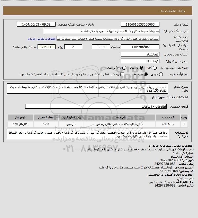 شرح کلی نیاز: نصب بنر بر روی پنل،بیلبورد و پیشانی پل های تبلیغاتی سازمان 6500 ونصب بنر با داربست فلزی 3 در 4 توسط پیمانکار جهت یکماه 150 عدد