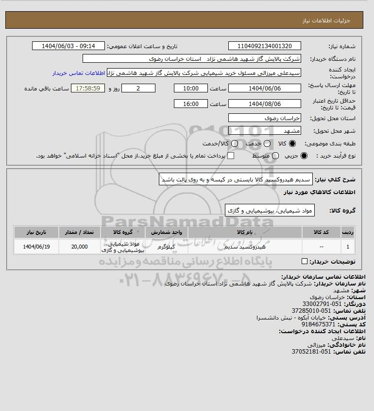 | 1 | -- | هیدروکسید سدیم | کیلوگرم | مواد شیمیایی، بیوشیمیایی و گازی | 20,000 | 1404/06/19 |