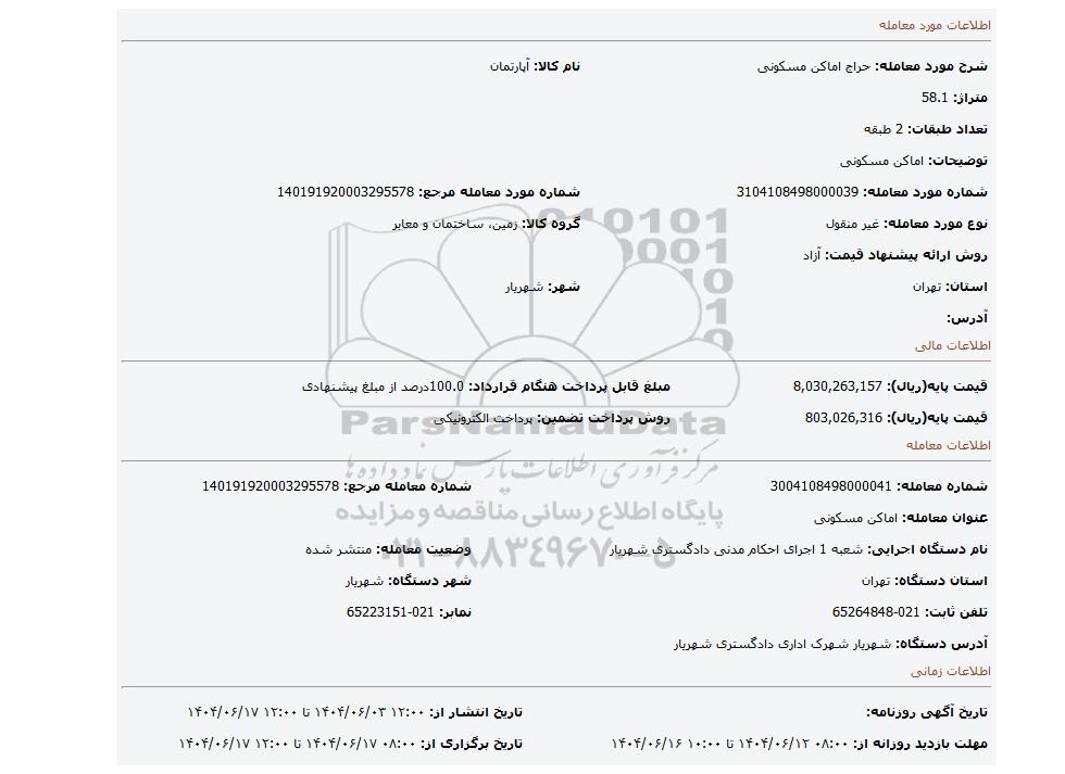 شرح مورد معامله: حراج اماکن مسکونینام کالا: آپارتمان