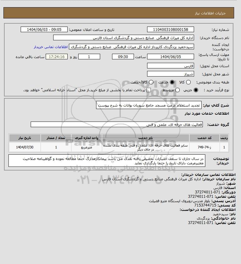 نام دستگاه خریدار:اداره کل میراث فرهنگی صنایع دستی و گردشگری استان فارس