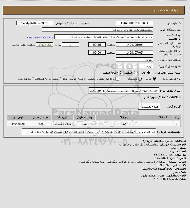 استعلام بها و موضوع استعلام استعلام قند تک حبه ای بسته بندی سیب سلامت دار /200کیلو به اطلاع کلیه شرکتها و افراد متخصص واجد شرایط میرساند، آگهی گذار در نظر دارد از طریق استعلام بها، نسبت به انتخاب و دریافت پیشنهادات اقدام نماید. این استعلام با کد آگهی ثبت شده در سامانه خبرگزاری پارس نماد : 9452846 منتشر شده است. مشخصات استعلام : تاریخ شروع استعلام: 1404/06/03 آخرین مهلت ارسال پیشنهاد قیمت : 1404/06/05 و محل اجرای پروژه : استان تهران میباشد. استعلام قیمت مورد درخواست : استعلام قند تک حبه ای بسته بندی سیب سلامت دار /200کیلو با دستهبندیهای تخصصی و گروه های مرتبط : مواد غذایی, استعلام اطلاع رسانی میگردد.