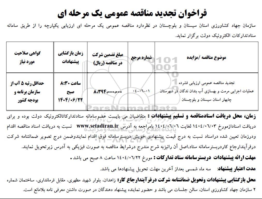 | تجدید مناقصه عمومی ارزیابی فشرده عملیات اجرایی مرمت و بهسازی آب بندان ندگان در شهرستان چابهار استان سیستان و بلوچستان | 04-06-01 | 8.394.000.000 | ساعت 8:30 صبح 1404.6.22 | حداقل رتبه 5 آب از سازمان برنامه و بودجه کشور |