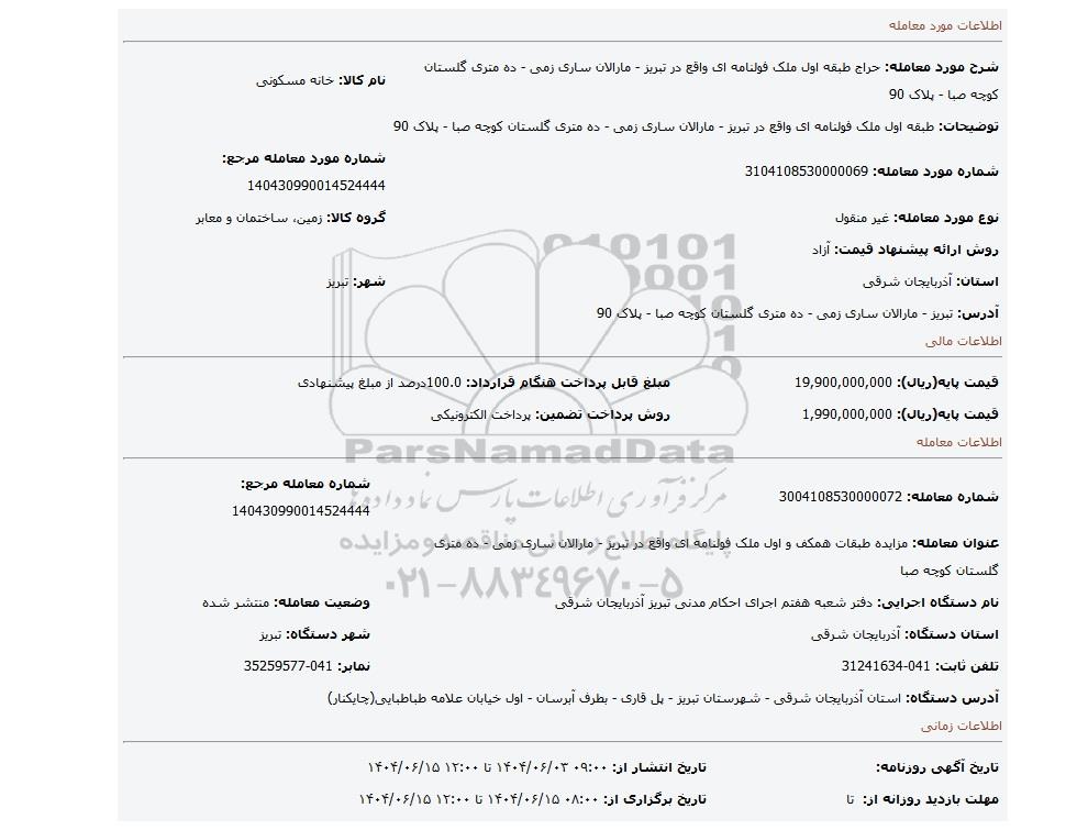 | عنوان معامله: مزایده طبقات همکف و اول ملک فولنامه ای واقع در تبریز - مارالان ساری زمی - ده متری گلستان کوچه صبا | ||