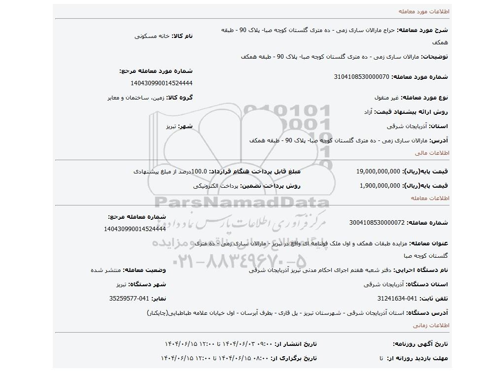 عنوان معامله: مزایده طبقات همکف و اول ملک فولنامه ای واقع در تبریز - مارالان ساری زمی - ده متری گلستان کوچه صبا