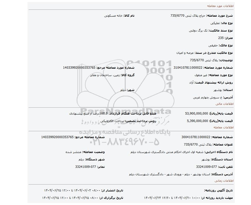 شرح مورد معامله: حراج پلاک ثبتی 735/6770 | نام کالا: خانه مسکونی | |
