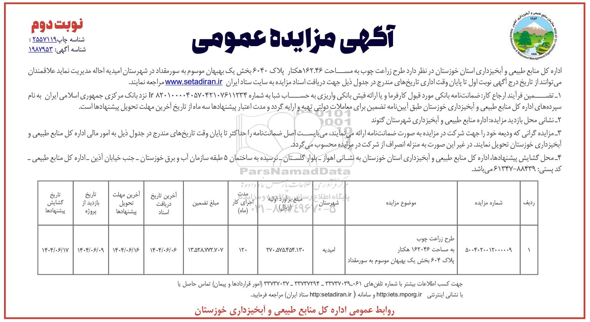 اداره کل منابع طبیعی و آبخیزداری استان خوزستان در نظر دارد طرح زراعت چوب به مساحت 162.46 هکتار پلاک 6040 بخش یک بهبهان و وسوم به سور مقداد در شهرستان امیدیه احاله مدیریت نماید. علاقمندان میتوانند از تاریخ درج آگهی نوبت اول تا پایان وقت اداری تاریخ های مندرج در جدول ذیل جهت دریافت اسناد مزایده به سایت ستاد ایران مراجعه نمایند