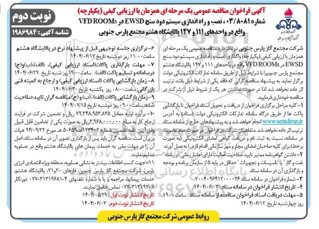 آگهی فراخوان مناقصه عمومی یک مرحله ای همزمان با ارزیابی کیفی یکپارچه شماره 03.8081 ، نصب و راه اندازی سیستم