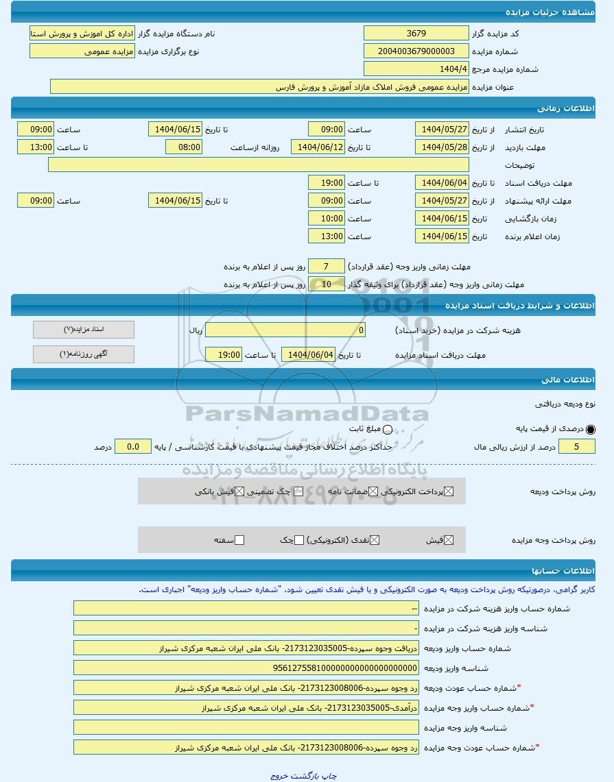 شماره حساب واریز وجه مزایده درآمدی-2173123035005- بانک ملی ایران شعبه مرکزی شیراز