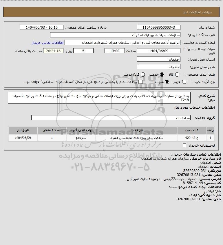 شرح کلی نیاز: بخشی از عملیات آرماتوربندی، قالب بندی و بتن ریزی آبنمای خطی و مرکزی باغ مشاهیر واقع در منطقه 5 شهرداری اصفهان-T248