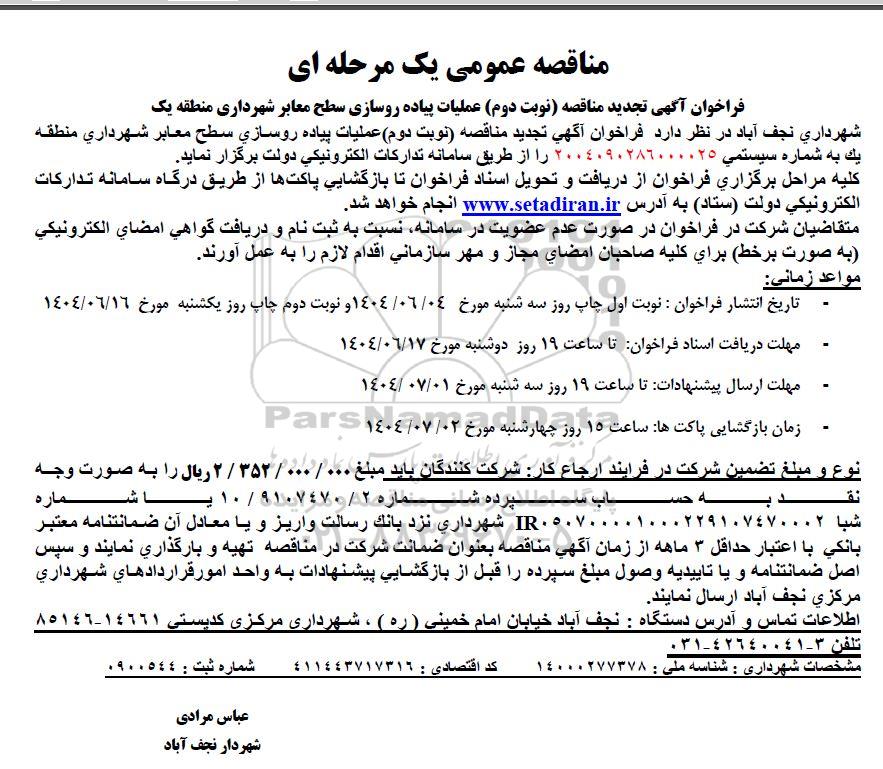 شهرداری نجف آباد در نظر دارد فراخوان آگهی مناقصه عملیات پیاده روسازی سطح معابر شهرداری منطقه یک به شماره سیستمی 2004090286000025 را از طریق سامانه تداركات الكترونیكی دولت برگزار نماید.