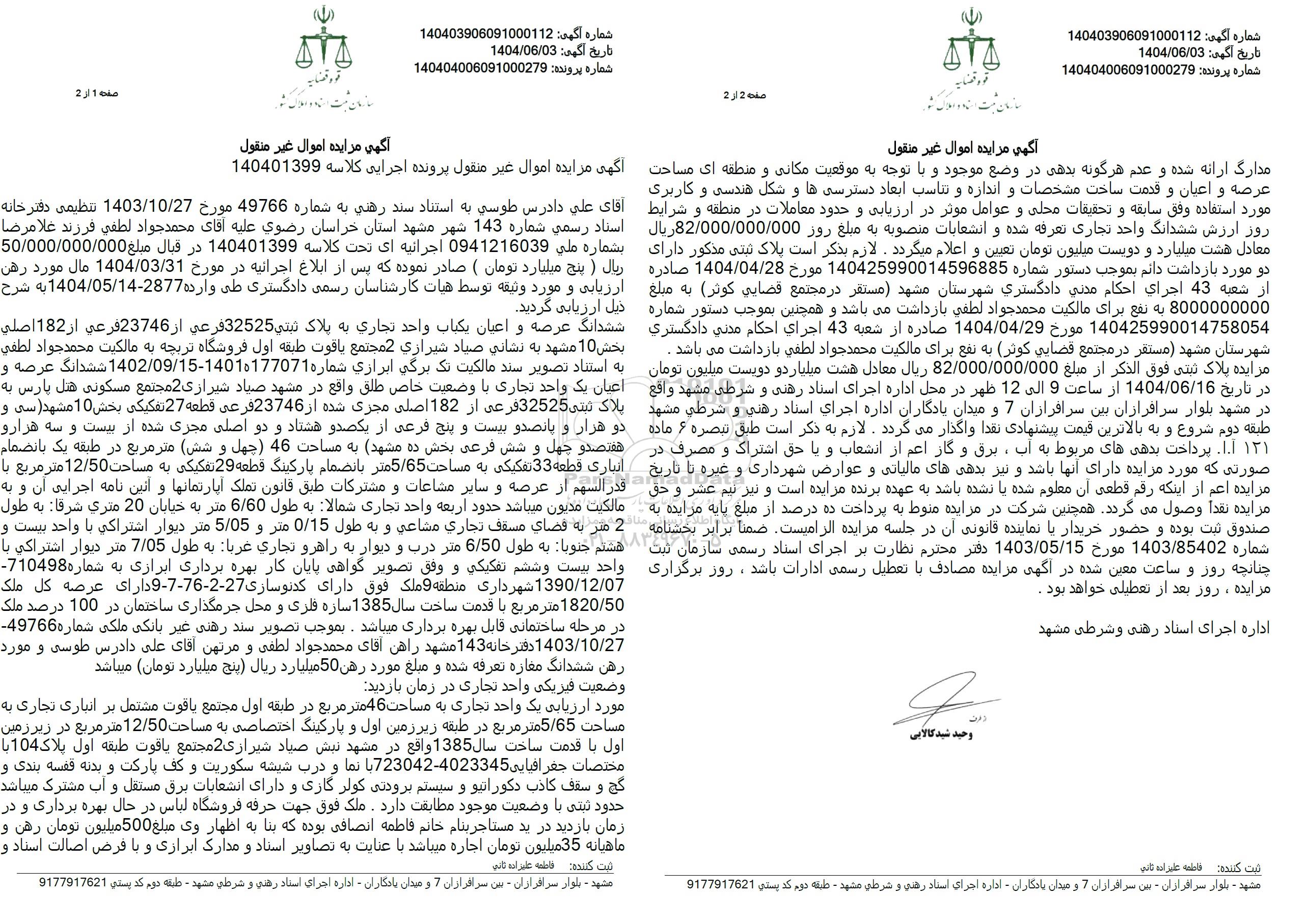 مزایده فروش ششدانگ یک واحد تجاری با پلاک ثبتی 32525 فرعی از 23746 فرعی از 182 اصلی